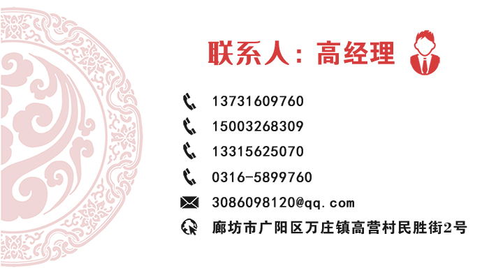 地址:廊坊市廣陽(yáng)區(qū)萬(wàn)莊鎮(zhèn)高營(yíng)村民勝街 聯(lián)系人:高經(jīng)理 電話(huà):13731609760